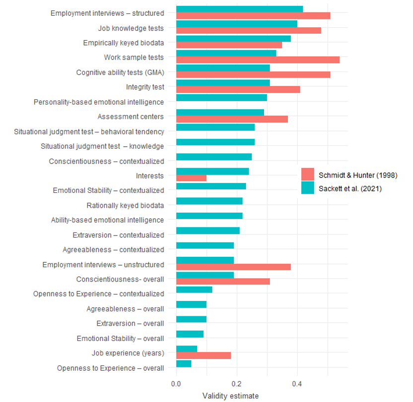 For comparison, the table below lists the validity estimates summarised in Schmidt & Hunter (1998) and revised estimates by Sackett et al. (2021). The figure includes additional revised validity estimates by Sackett et al. (2021), not available in Schmidt & Hunter (1998).